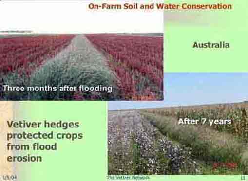 | Erosion problems occur not only on steep slopes, but also on fairly flat land (<1%) as well. The black cotton soils of the Darling Downs of Queensland, Australia are subject to occasional flooding that causes major erosion problems. As a result a method of strip cropping has been devised that takes about 33% of the land out of cultivation. Under Australia's Land Care Program farmers planted vetiver hedgerows across the slope. Erosion was effectively minimized, flood damage became insignificant and the hedgerows stayed where they were planted - even after 7 years as shown on the image to the bottom right. Note the good crop of cotton and maize on either side of the vetiver hedgerow. Better still more than 90% of the land can be cultivated, and excess fertilizers and agrochemicals are trapped by the vetiver hedgerows. | ||||||||||||