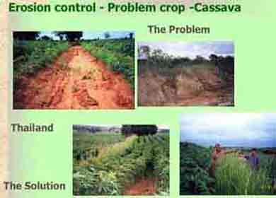 | Cassava (Manihot esculenta Crantz) is the third most important food crop in southeast Asia. Most farmers realize, that cassava production on slopes can cause severe erosion, while production without fertilizers will lead to a gradual decline in soil productivity. Research has shown that cassava yields can be maintained for many years with adequate application of fertilizers and/or manures, and that there are various ways to reduce erosion. In order to enhance the adoption of soil conserving practices and improve the sustainability of cassava production under a wide range of socio-economic and bio-physical conditions, a farmer participatory research (FPR) approach was used to develop not only the best soil conservation practices, but also to test new cassava varieties, fertilization practices and cropping systems that tend to produce greater short-term benefits. The farmer participatory approach to technology development and farmer-to-farmer extension has been further developed and the total number of sites has rapidly expanded to about 32 sites in Thailand, 35 in Vietnam and 23 in southern China (KB63).In Thailand, farmers in almost all sites selected the planting of contour hedgerows of vetiver grass as the most effective and most suitable practice to control erosion. In 2002 nearly 900 farmers in 18 sites in eight provinces in Thailand had planted a total of 130 km of vetiver grass hedgerows in close to 950 ha of cassava fields. Through the use of a farmer participatory extension approach, including cross visits, farmers’ field days, training courses and the establishing of community-based self-help groups, the number of farmers planting vetiver grass is growing day by day. In the long-term, this will result in less erosion and the conservation of soil and water resources to the benefit of farmers as well as the community as a whole. | ||||||||||||