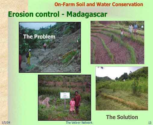 | Madagascar is typical of most tropical countries where rainfall is high and erosion is a major problem. In addition Madagascar is subject to frequent cyclones that create huge slips on unprotected slopes. In this instance the land slides not only negatively effected the rural poor but also created severe economic loss to a whole sub-region because of damage to the railway line. Through an ingenious system of "crop - vetiver modules", good community involvement and education, and a properly funded and managed program (KB276), the results were impressive. Soil erosion and land slippage was halted, farmer income improved substantially and the recommissioned railroad continued to operate even under the harshest climatic conditions. Vetiver System technology was the "glue" that enabled the program to work. It stopped the land slides, prevented erosion and improved crop productivity (both annual and perennial tree crops). The farmers were delighted and started spreading the technology to adjacent farmers | ||||||||||||