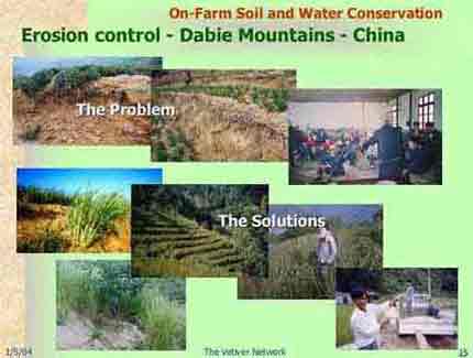 | The Dabie Mountains is host to some of China's poorest people. This mountainous area in Anhui Province is heavily eroded and the soils are each year becoming more infertile. The China Vetiver Network, the Salvation Army, and local governments programmed and funded a project (KB347) to provide improved services and technologies to farmers in a pilot area. The project was based on many years of investigation, scientific trials and on the local social and economic situation, local government and farmers warmly welcomed it. The project used Vetiver System as a key component for erosion control. At the same time emphasis was put on economic tree production and water conservation so that farmers could better their profits. Currently the China Vetiver Network is seeking additional benefits for farmers through vetiver handcraft making, by providing vetiver pruning or crude process materials to the handcraft factories that have close cooperation with export agencies. | ||||||||||||