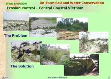 | Farmers in Central Coastal Vietnam are regularly confronted with flood or storm related damage, and have to spend much of their time and money to restore badly damaged structures. The measures they have used include stabilization of dykes by local grass, which are easily uprooted by flood, or small waves, hence are not effective, or short-term measures such as blocking sand dune flow by sand dykes, which themselves are poorly stabilized due to lack of vegetation cover. Technical support, when available, has its own problems. Local civil engineers are used to more expensive hard solutions such as rocks and cement, even these solutions are not always effective or durable. Agro-forestry projects focus on tree planting but it is expensive to implement and slow in growth. Trees are effective for wind erosion control but they give little protection against neither water erosion nor trapping sand eroded by heavy rainfall. With a small grant from the Netherlands Embassy, a vetiver trial and demonstration project was initiated in 2001 (KB812). The results were outstanding and both local farmers and engineers now adopted VS as their preferred option for sand dune and road batter stabilization, stream bank erosion control and fishpond stabilization | ||||||||||||