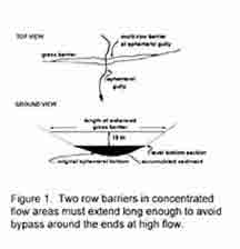 Where sheet and rill erosion are controlled with other practices such as residue management, separate and discrete barrier sections may be installed across concentrated flow areas to control ephemeral gully development. When used to control only ephemeral erosion, barriers do not need to extend across the ridgetops but only long enough to prevent bypass flow around the ends. This bypass flow can be avoided if each strip is extended far enough to provide 1.25 feet of elevation above the base level section that will develop after a few years of sedimentation (fig. 3i-2). High on the slope where contributing areas are small, barrier lengths need not be this large.