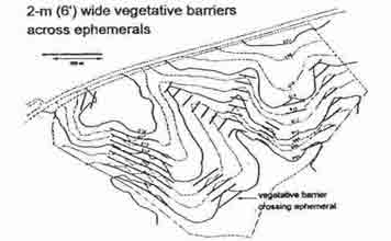 Gradients along barriers should be 0.6 percent or less except where the vegetative barriers cross concentrated flow areas. Gradients entering a concentrated flow area may deviate from this criteria for a distance of 100 feet on either side of the concentrated flow area. This helps to get better row alignment.